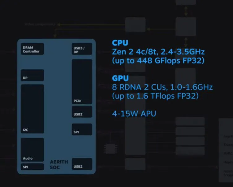 The AMD chip inside the Steam Deck has a name: it’s the Aerith SOC, a clear reference to the famous Aerith from Final Fantasy VII. It’s an APU with a power envelope of between 4 and 15 watts, and it contains both an 4-core, 8-thread AMD Zen 2 CPU that runs between 2.4-3.5GHz, and 8 AMD RDNA 2 compute units worth of graphics clocked between 1 and 1.6GHz, for a total of 1.6 teraflops of raw graphical compute.