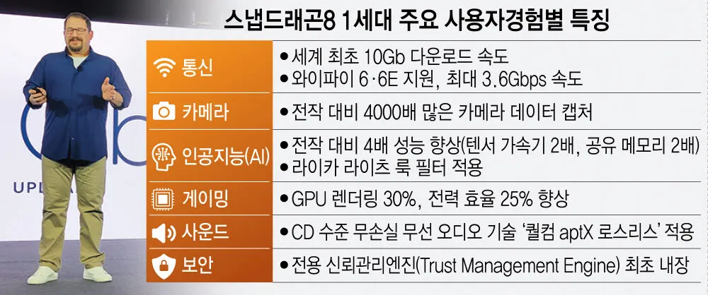 스마트폰 사용자가 느낄 수 있는 모바일 경험은 크게 6개로 압축할 수 있다. 연결성(통신), 카메라, 사운드, 보안, 게임, 인공지능(AI) 등이다. 스냅드래곤8은 이런 모바일 UX를 극대화했다.