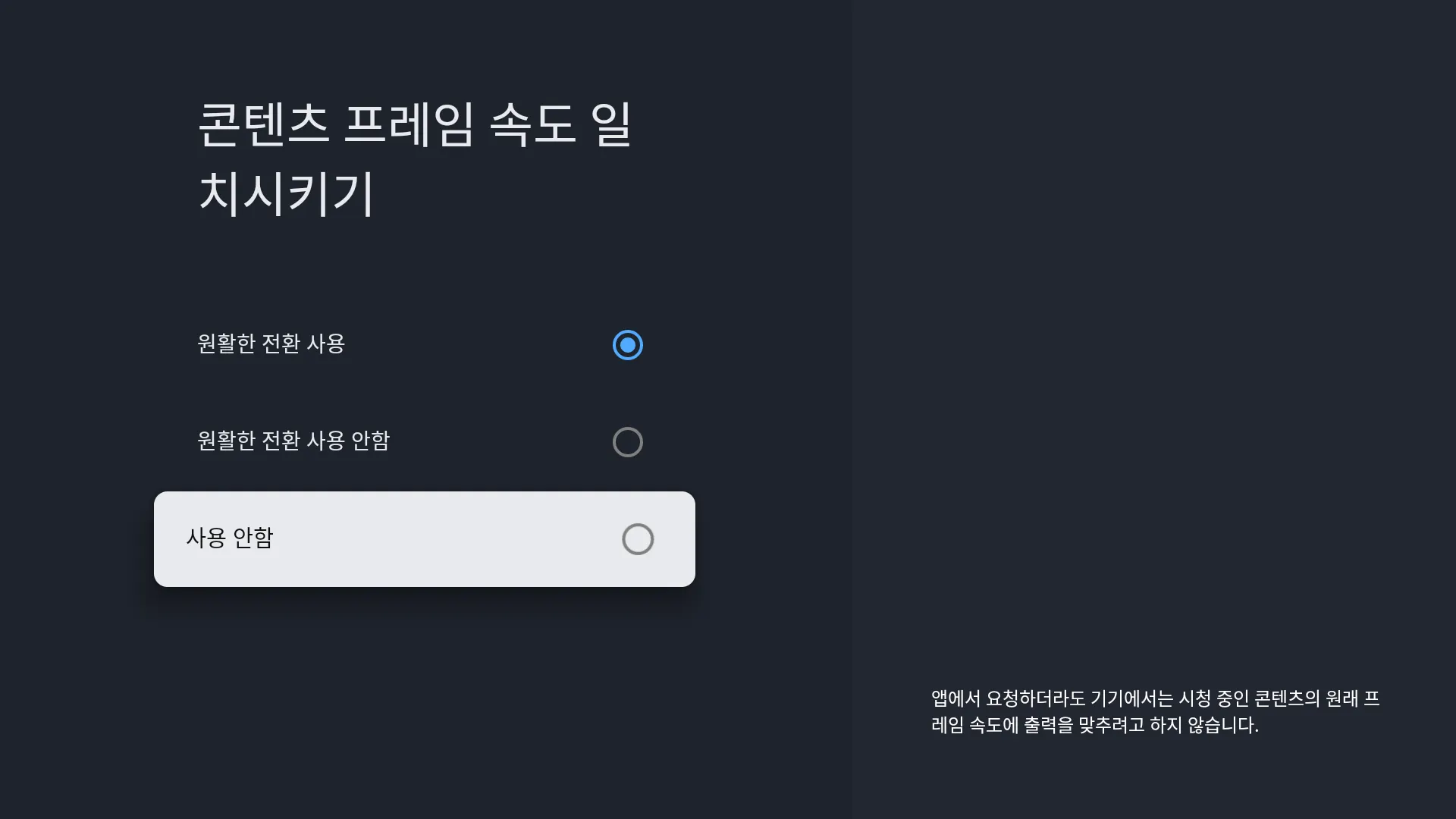 이후에도 화면이 정상 출력되지 않는 경우, 설정 화면 → 화면 및 소리 → 콘텐츠 프레임 속도 일치시키기 값을 사용 안 함으로 변경합니다.