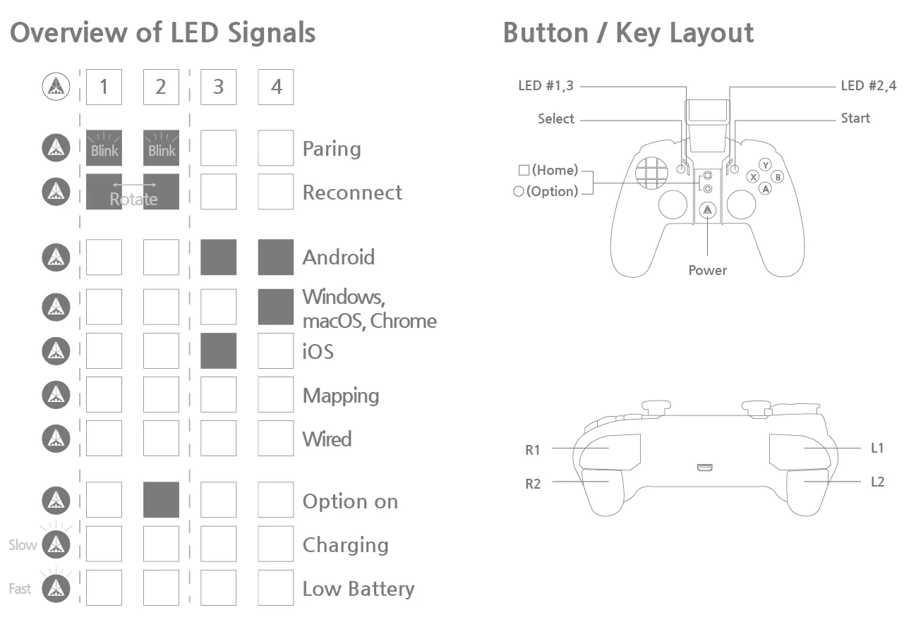 How to use mode change in a sequential way: Press "Select+L1" button key together until LED on. Then, automatically its power becomes off. Power on again, press "Select+L1" button again for booting. And check the mode. If not it is not in the right model, repeat this process until you see the right LED position to match the mode you want to match. The mode will change sequentially from AndroidโWindows, Macโ iOSโ Android Mapping.