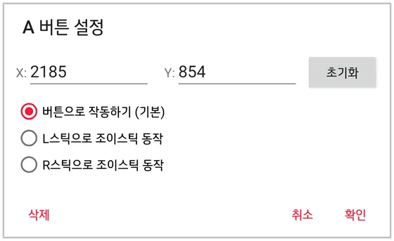 드래그 형태로 슬라이드하는 컨트롤을 기대하시는 분들이 많이 계신 것으로 생각됩니다. 슬라이드를 사용할 때 단순히 터치 해서 전달할 때와 슬라이드할 때를 구분하여 진행하고 싶으실 것입니다. 이 경우는 매핑하실 때 각 버튼을 길게 누르신 후 아래 팝업에서 원하는 스틱을 사용하여 드래그 할 수 있도록 설정하시는 것을 추천합니다.